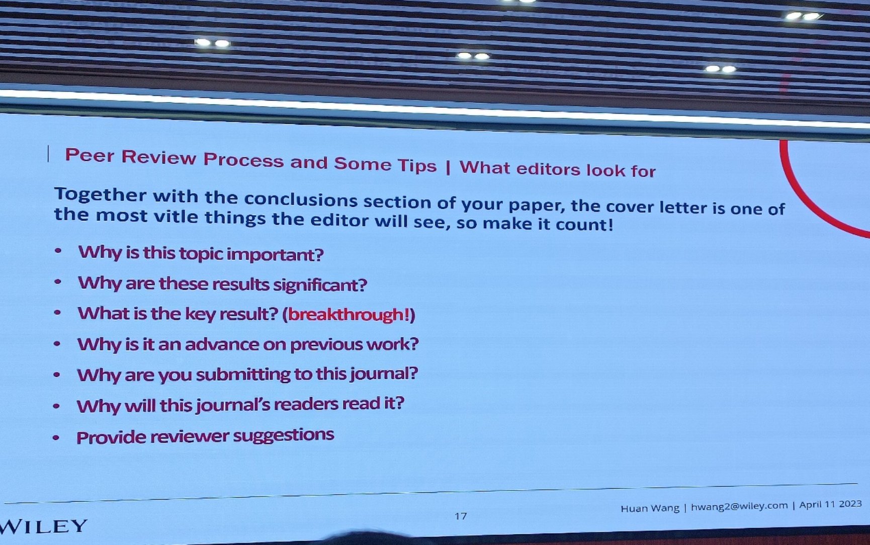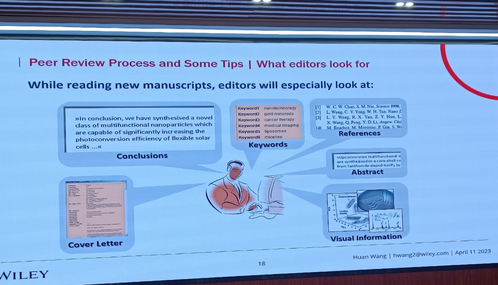 其中,王欢主编重点强调了投稿信的作用,它直接决定了一篇论文是否可以走到同行评审阶段。为此,王欢主编详细介绍了投稿信的篇幅、布局、结构等注意事项。