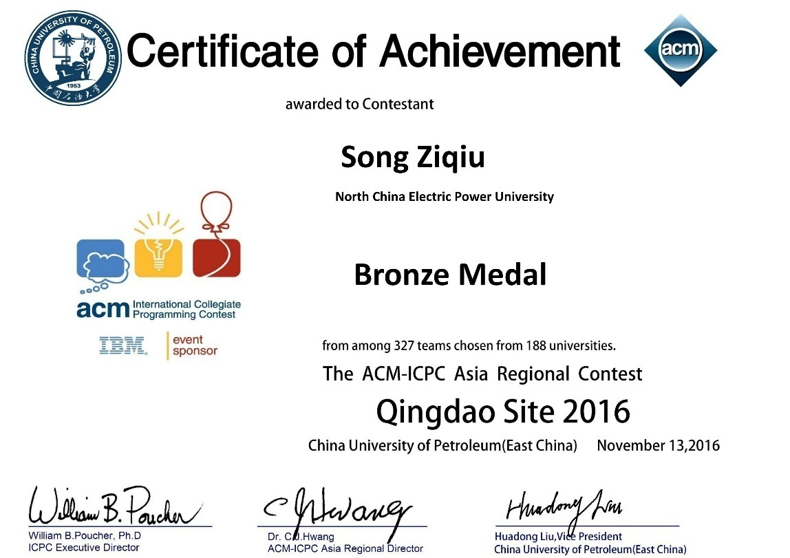 ACM/ICPC国际大学生程序设计大赛亚洲赛区青岛站铜牌