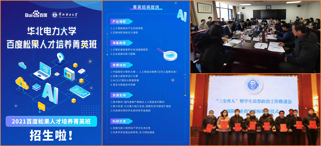 搭建创新创业平台,强化协同育人。为加强创新性、应用型、技能型等复合型人才培养,学院紧密结合行业和社会发展的需求,深入推进校企联合人才培养和协同育人工作。学院同百度公司共同承办中国高校人工智能人才国际培养计划同时,同步设立华北电力大学-百度松果人才培养菁英班,开展线上实践和线下交流相结合的免费授课。学院同国家电网公司大数据中心在大数据、人工智能、能源互联网等方向开展深度合作,并聘请了企业导师。为进一步提升学生创新创业实践能力,学院聘任了新一届13名创新创业指导教师,以促进学生实践能力的提升。