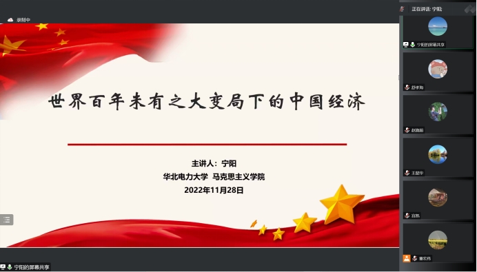 与新能源学院联合开展学院党委理论学习中心组(扩大)学习暨党的二十大精神专题宣讲会。会议邀请马克思主义学院宁阳教授作“世界百年未有之大变局下的中国经济”专题报告。两学院中心组成员、全体教职工以及学生党支部书记参加会议。会议由控计学院党委书记王韶华主持。
