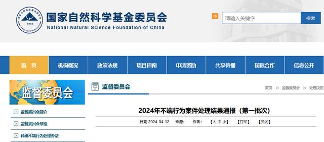 据国家自然科学基金委员会网站4月12日消息,近期,经国家自然科学基金委员会监督委员会调查审议、国家自然科学基金委员会委务会议审定,国家自然科学基金委员会对相关科研不端案件涉事主体进行了处理。现根据有关规定,将有关案情及处理结果予以通报。