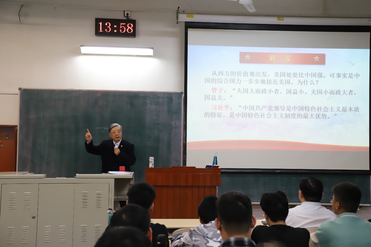 校关工委常务副主任、原党委副书记朱常宝围绕“中国共产党为什么是民族复兴的领导核心”这一主题,从党的指导思想、人民立场、独立自主、革命理想、世界眼光和自我革命六个方面进行讲解。他指出,中国共产党书写了一部坚守初心使命、应对危局困境、经受风险考验、战胜困难挫折、开创民族复兴伟业的光辉历史,作为当代大学生要坚定共产党员理想信念,守住四条底线——法律底线、纪律底线、政策底线、道德底线,树立正确学习观,在日常学习生活中起到模范带头作用。