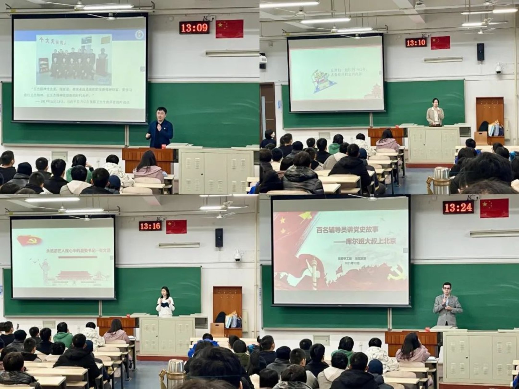 孙笑宇老师为大家分享了“一不怕死、二不怕累”的王杰精神,带领同学们在王杰日记中感悟榜样的力量和薪火相传的精神。高新慧老师用时光机和同学们一起回顾了“电路医生”许启金的一生,学习那份甘于平凡、不忘初心、将平凡的小事做好的伟大劳模精神。“为什么要为县委书记谷文昌在中央党校内建雕塑?”刘璐老师抛出疑问后,用精彩的讲述让同学们明白了何为“心中有党、心中有民、心中有责、心中有戒”。地瓦那夏老师为大家带来新疆库尔班大叔的故事:他一生都在践行对党的庄严承诺,致力于让各民族像石榴籽一样紧紧的抱在一起。