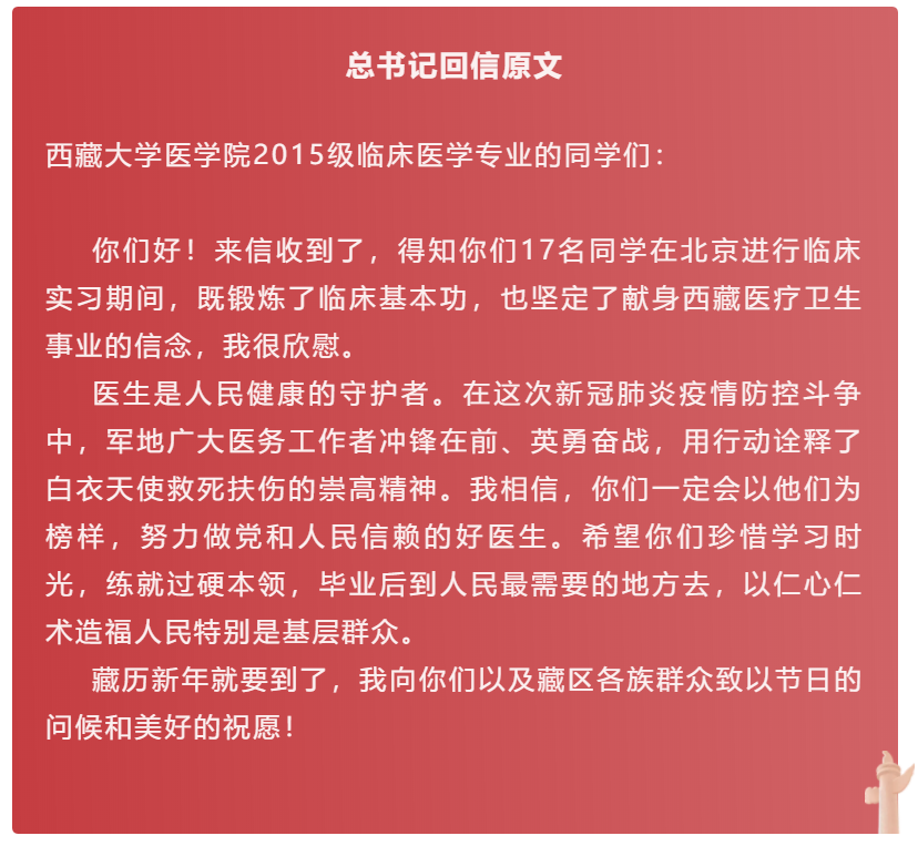 在藏历新年来临之际,习近平总书记亲自给西藏大学医学院学生回信,信的内容虽然不长,但字里行间饱含着对广大莘莘学子的亲切教诲、殷切期望,对全国各族人民的关心关怀、深情厚谊。同时,也充分体现了习近平总书记对西藏工作的高度重视,让我们深受感动、倍受鼓舞。
