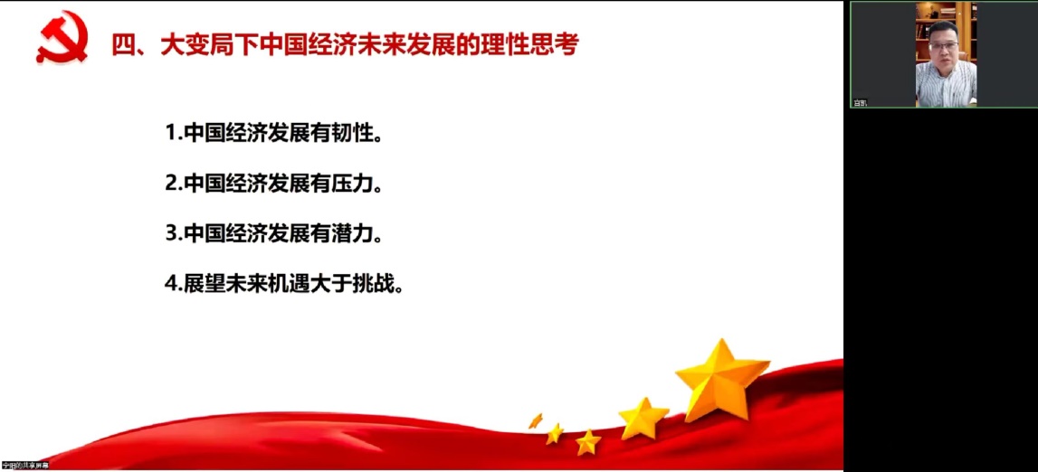 宁阳教授在报告中强调,党对经济工作的集中统一领导、以人民为中心的根本立场、社会主义市场经济体制改革、新发展理念的统领作用、供给侧结构性改革的主线地位、经济发展双循环的新发展格局,是中国经济在大变局下彰显出的显著制度优势。当百年变局叠加世纪疫情,中国经济、世界经济都面临剧烈变革。中国繁荣发展的稳定性给了世界稳定预期。十年伟大变革和巨大成就为中华民族伟大复兴奠定了坚实基础,中国经济的未来机遇大于挑战,中国经济的光明前景是确定的。