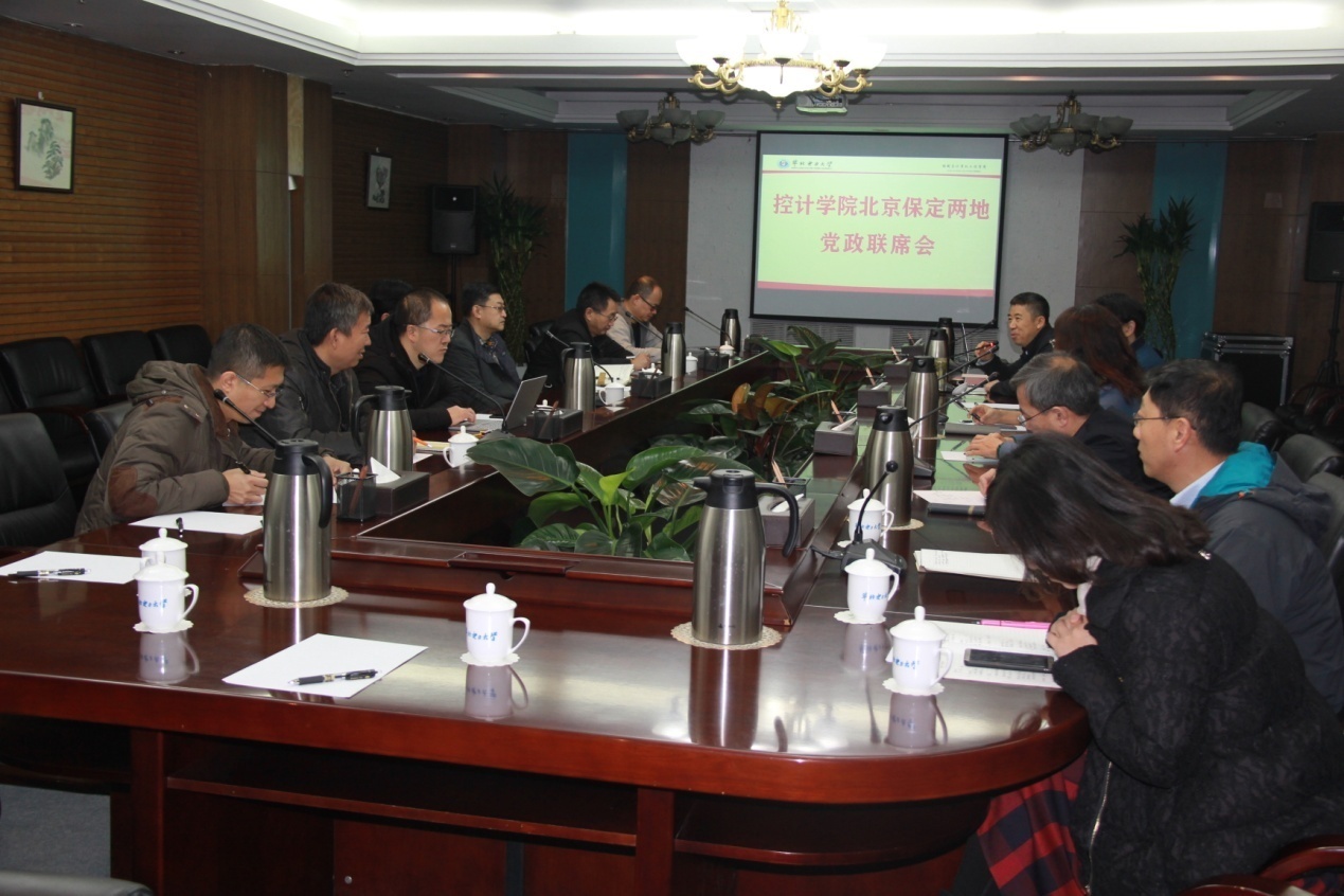 2019年12月15日,杰克论坛 在北京校部召开了北京保定两地党政联席会,共商党建与课程思政工作、学科建设、教育教学、学生培养等方面的一体化发展事宜。控计学院、自动化系、计算机系党政班子成员参加,会议由刘威主持。